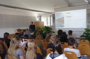 In einer schwungvollen Präsentation stellte sie unseren SchülerInnen das Unternehmen sowie die Ausbildungsmöglichkeiten für Lehrlinge im Betrieb vor. Neben den Tätigkeiten des KFZ-Technikers lernten die Mädels und Burschen das Berufsbild des Einzelhandelskaufmanns/frau mit Schwerpunkt Kraftfahrzeuge und Ersatzteile aus erster Hand kennen und einige Burschen zeigten sich sehr interessiert.