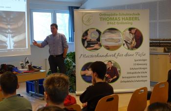 Orthopädie-Schuhmachermeister Thomas Haberl aus Gröbming informierte unsere SchülerInnen am 11. November nach einem kurzen Überblick über seinen Werdegang über die Leistungen, die man in seinem Betrieb in Anspruch nehmen kann. Weiters beschrieb den Mädchen und Burschen ausführlich das Berufsbild des Orthopädie-Schuhmachers. Dabei unterlegte er seine Ausführungen mit vielen verschiedenen Anschauungsmaterialien und Bildern! Eine Lehrstelle ist überdies in Planung – also eine weitere Option für die kommenden Schnuppertage!